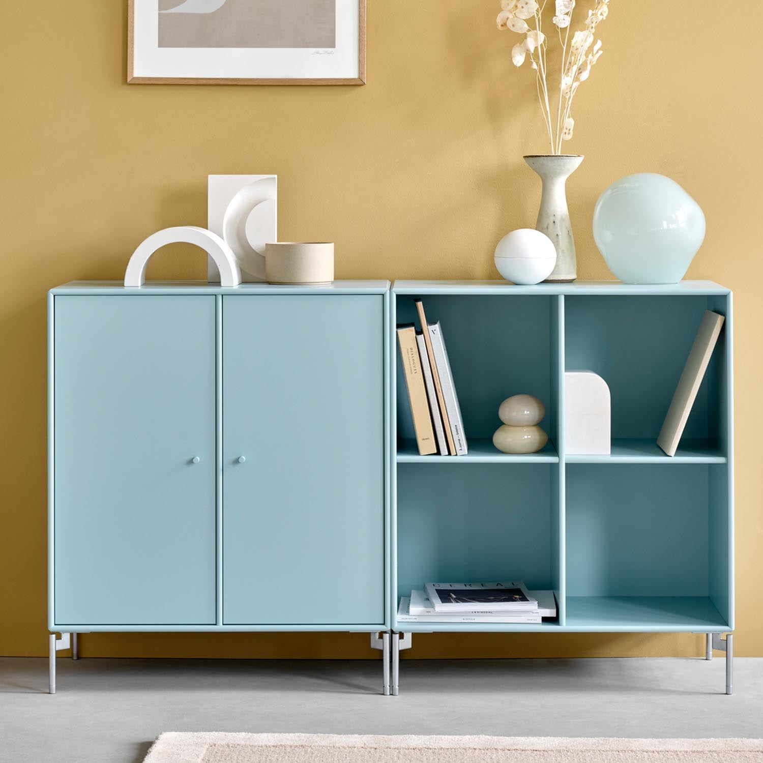 Dette skapet som heter "Cover" er et modul som måler 69,6 x 69,6 cm, det har en dybde på 30 cm og kommer med to lange dører med Montanas gjenkjennelige håndtak i samme lakkfarge. Bak hver av dørene er det en hylle, denne kan justeres i høyden om man knepper av dørene. Her følger det med en opphengslist som modulet henges på etter listen er montert på veggen.