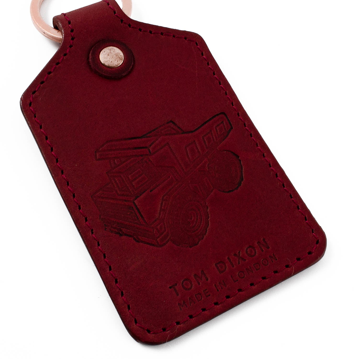 Tom Dixon nøkkelring og skinn Tag med en truck på forsiden. Sydde kanter og kobber-ferdig ring.