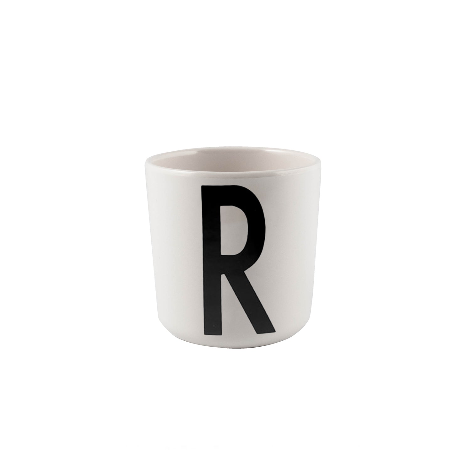 Melamin kopper med sorte bokstaver fra alfabetet. Typografien er designet av den danske arkitekten Arne Jacobsen, disse krusene er perfekte som gaver eller memento.