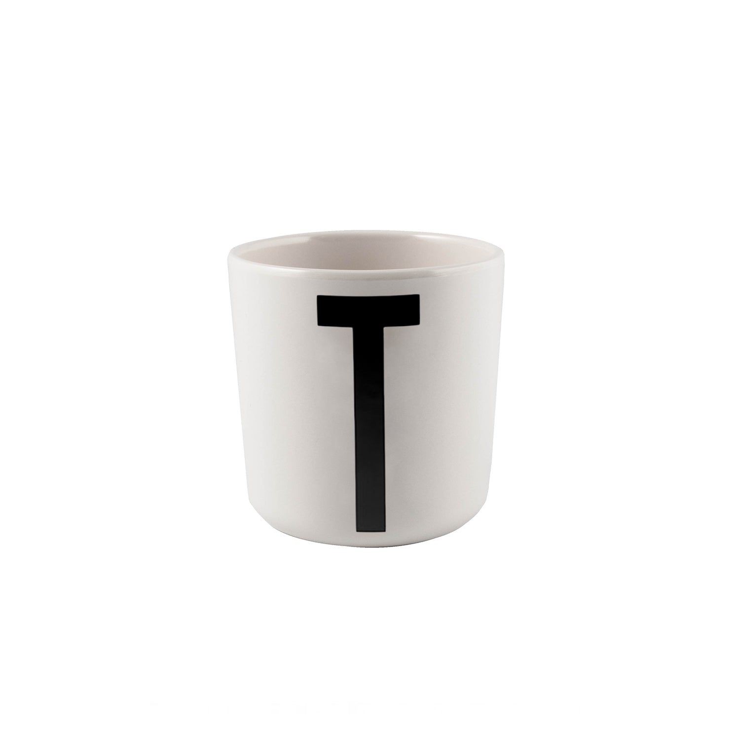 Melamin kopper med sorte bokstaver fra alfabetet. Typografien er designet av den danske arkitekten Arne Jacobsen, disse krusene er perfekte som gaver eller memento.