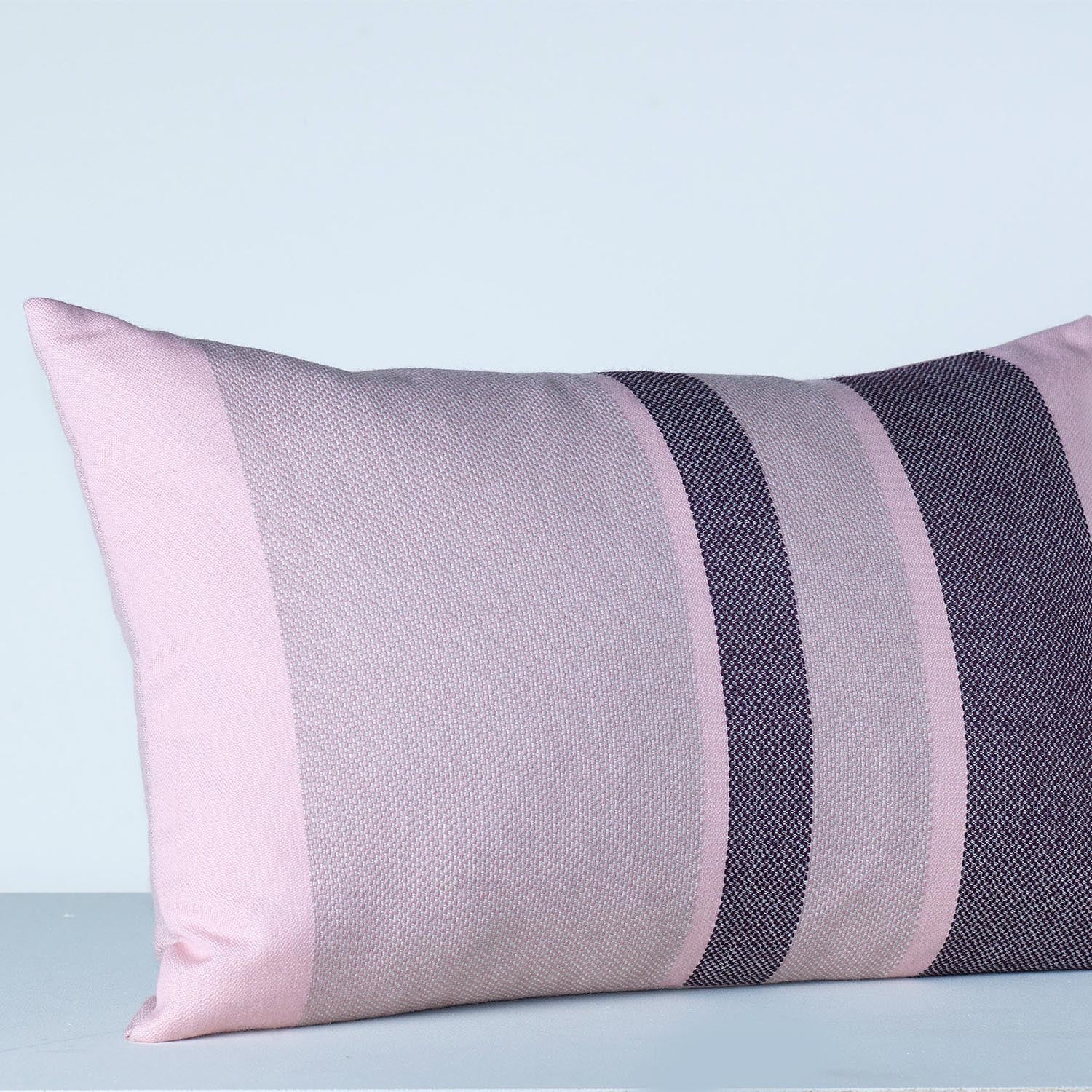 Kolleksjonen har blant annet striper slik som denne puten i en dus rosa og en mørkere lilla som kontrast. Inspirert av Norges sensommer netter og nydelige solnedganger.