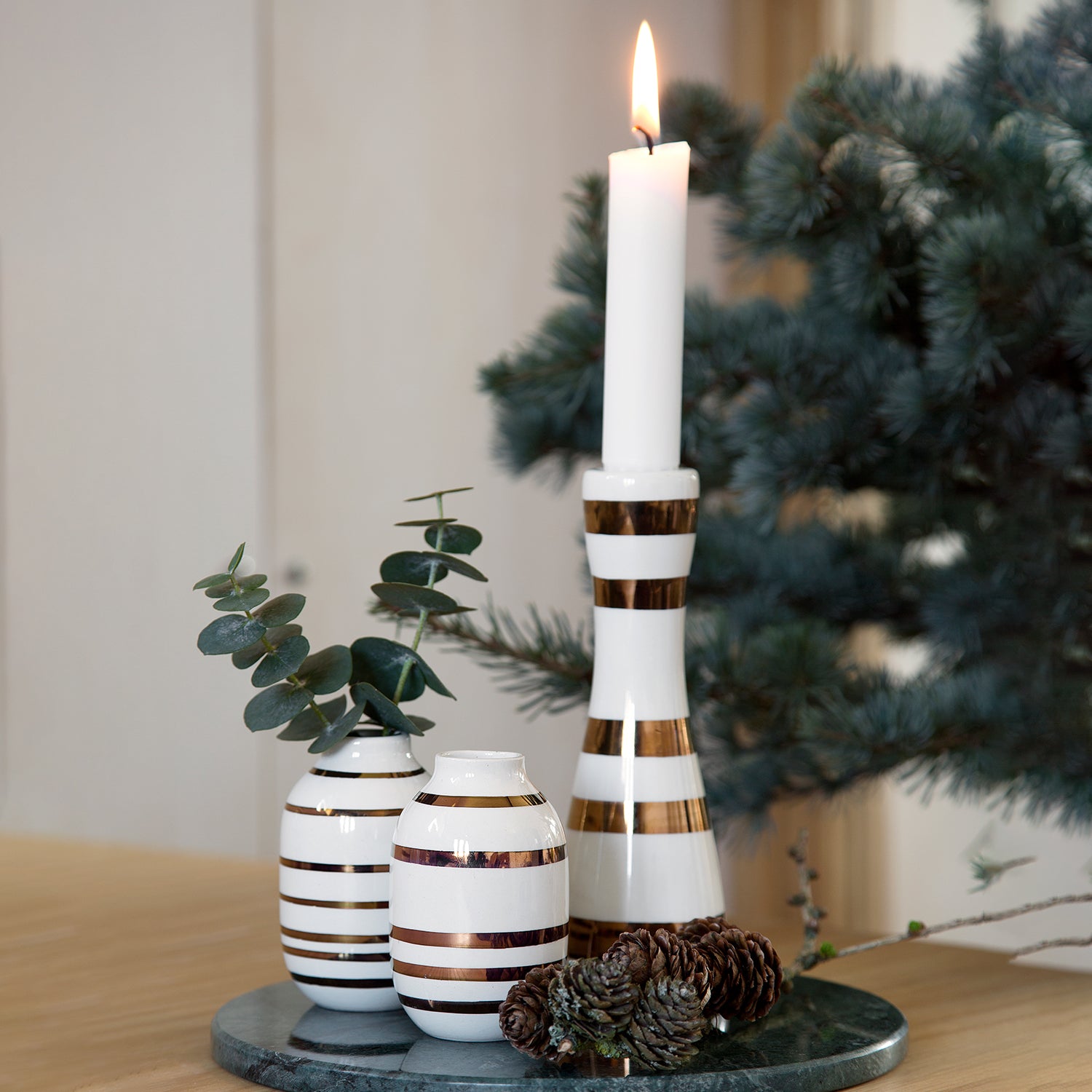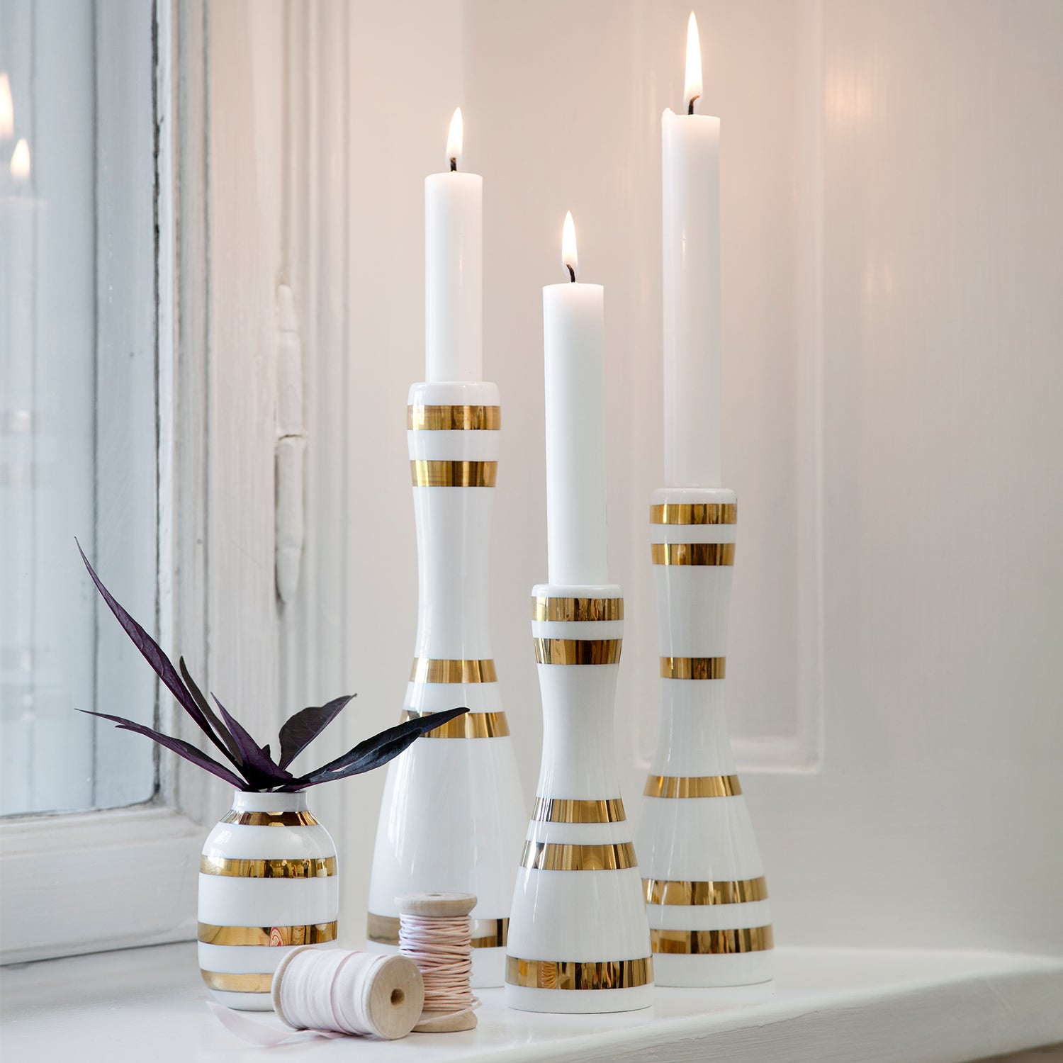 Vakre lysestakene fra Kähler med gullstriper. Gullstripene er kjærlig malt for hånd, og det er grunnen til at alle Kähler-lysestaker er unike. Stripene pynter fint på Omaggio-seriens minimalistiske lysestaker og fører elegant lysestakene sammen med resten av julepynten. La seriens største lysestake med sølvstriper skinne i lyset.