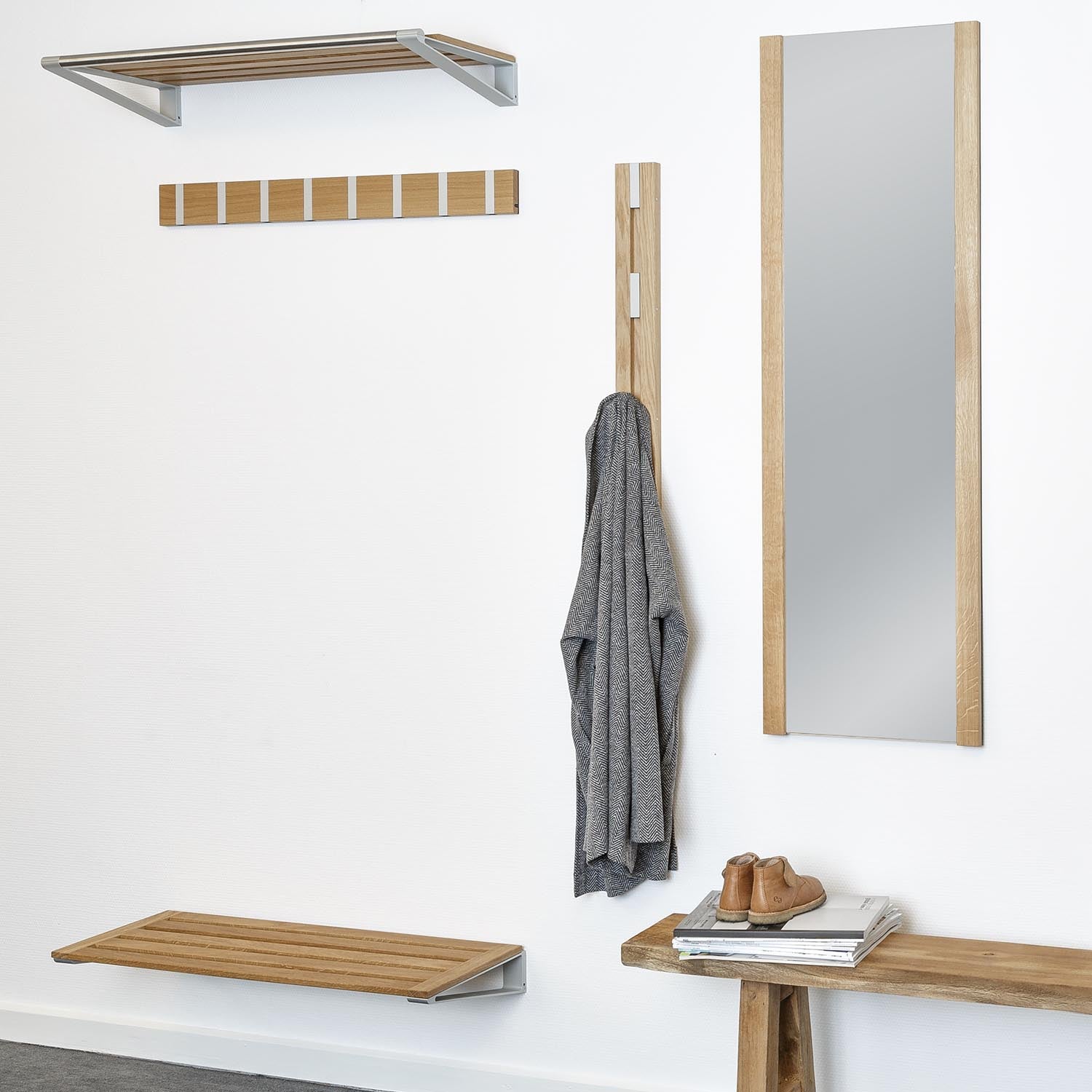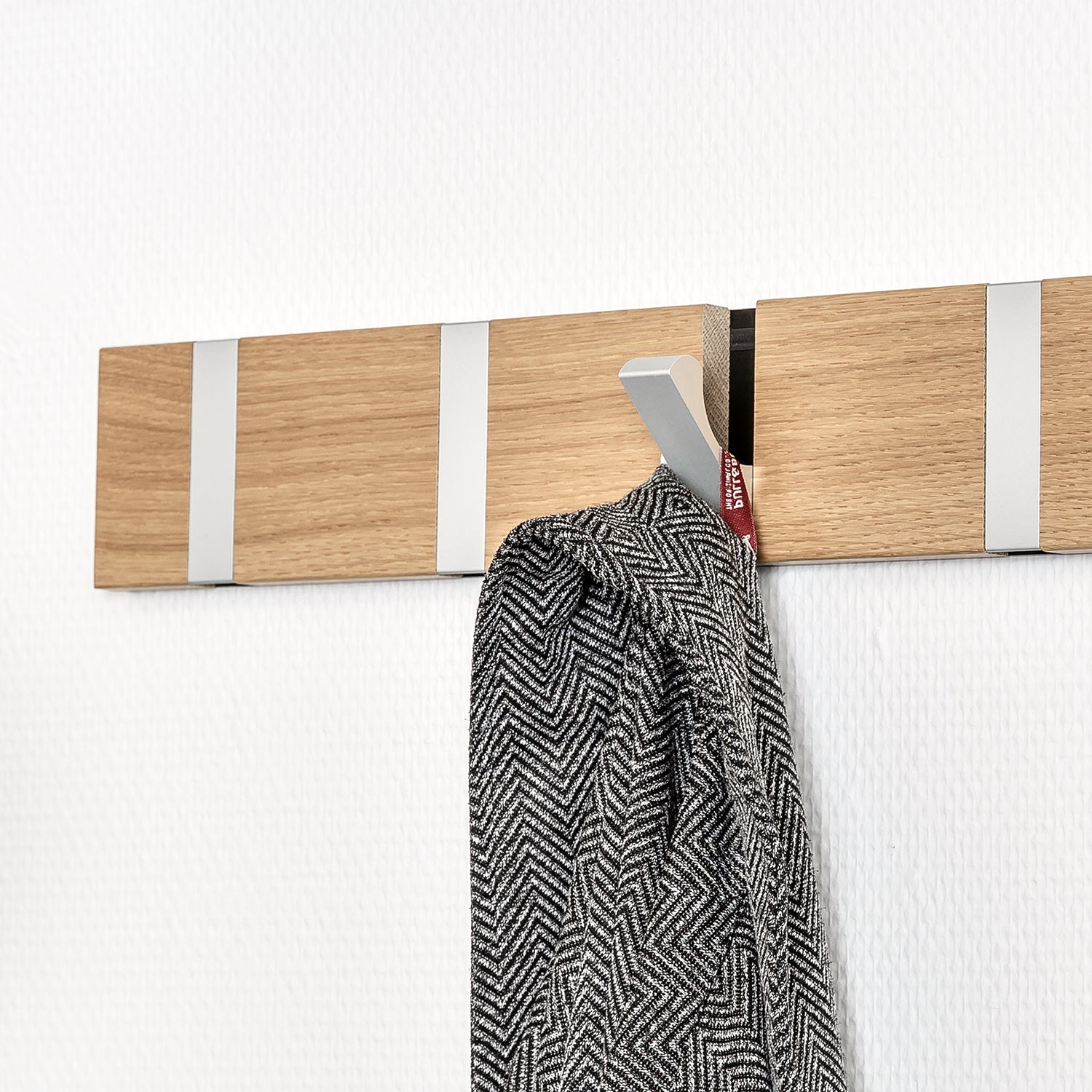 Denne er i oljebehandlet eik og med 4 knagger i aluminium. Knaggene trekkes enkelt ned og når de ikke brukes går de tilbake igjen. Perfekt i en smal gang eller bak en dør.