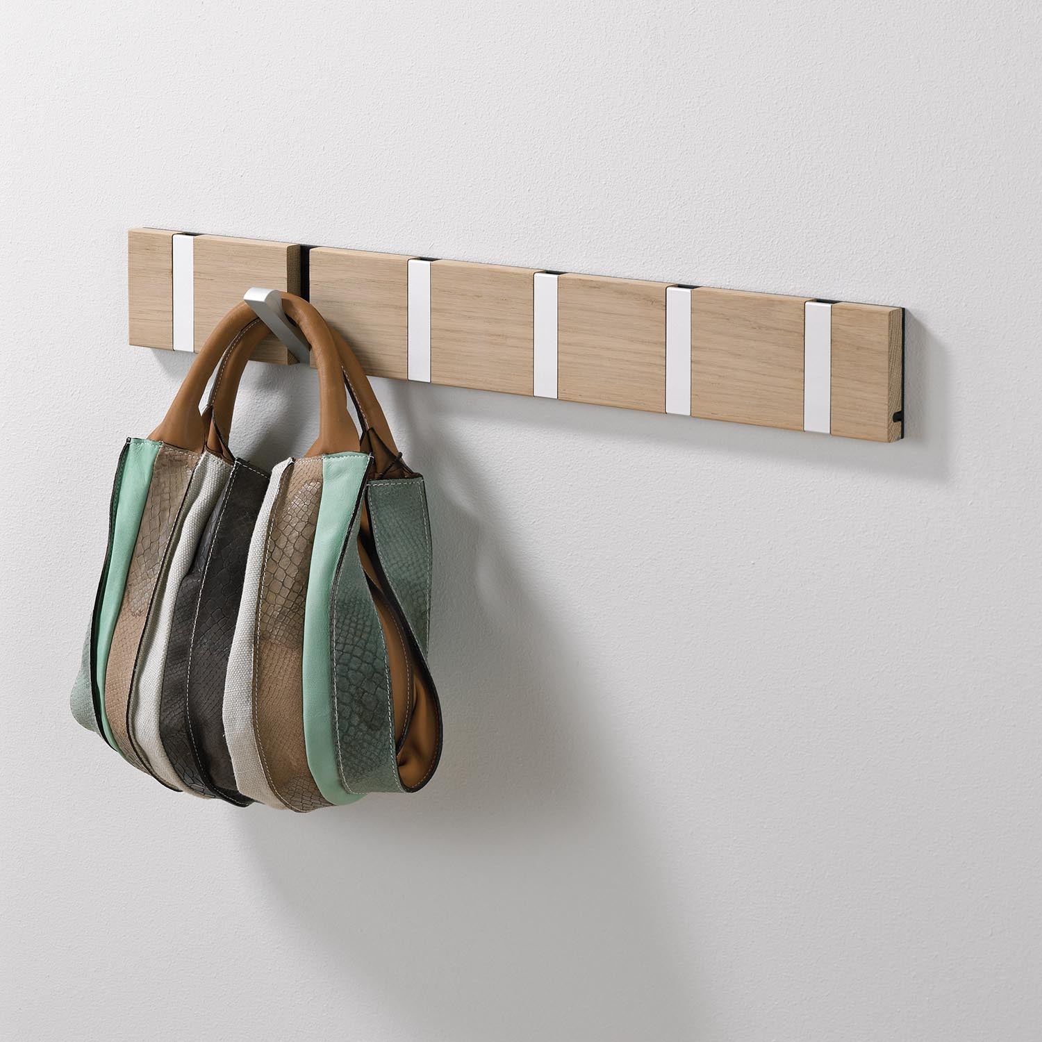 Denne er i såpebehandlet eik og med 6 knagger i aluminium. Knaggene trekkes enkelt ned og når de ikke brukes går de tilbake igjen. Perfekt i en smal gang eller bak en dør.