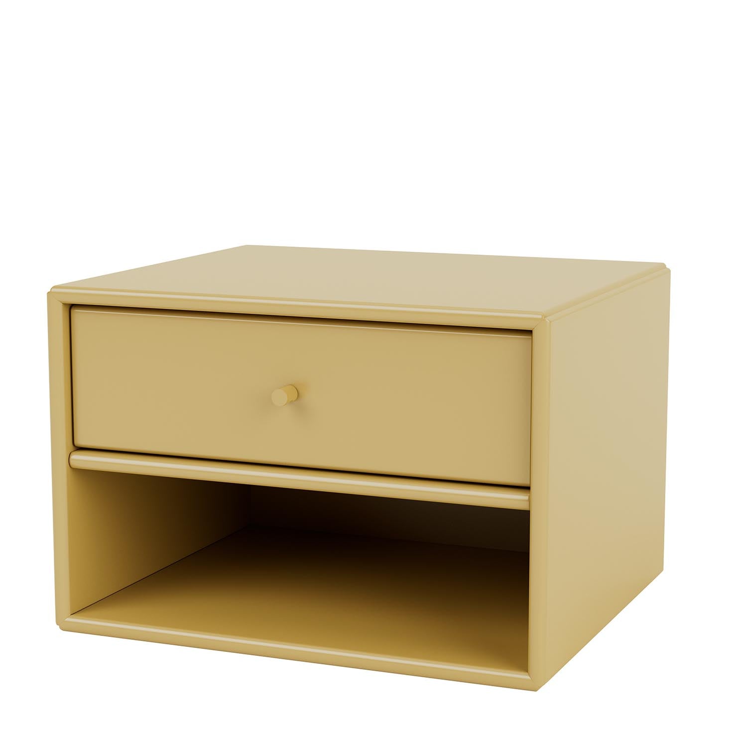 Dette nattbordet som heter "DASH" er et modul som måler 35,4 x 24 cm, det har en dybde på 30 cm og kommer med en liten skuff og en åpen hylle, med Montanas gjenkjennelige håndtak i samme lakkfarge. Opphengslisten følger med og henges enkelt opp på veggen.