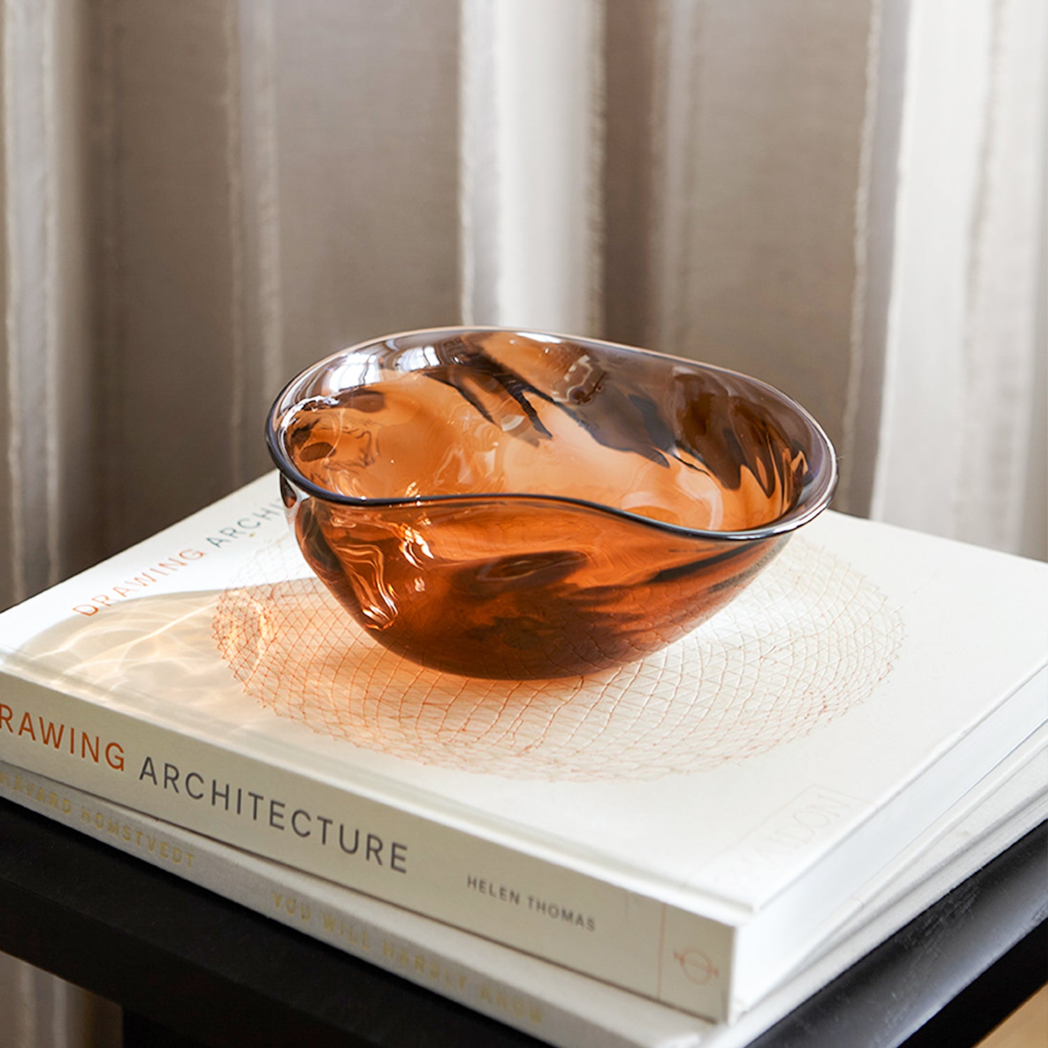 Limited edition munnblåst skål i ravfarget glass. Hver enkelt skål er unik og fargen kan variere.