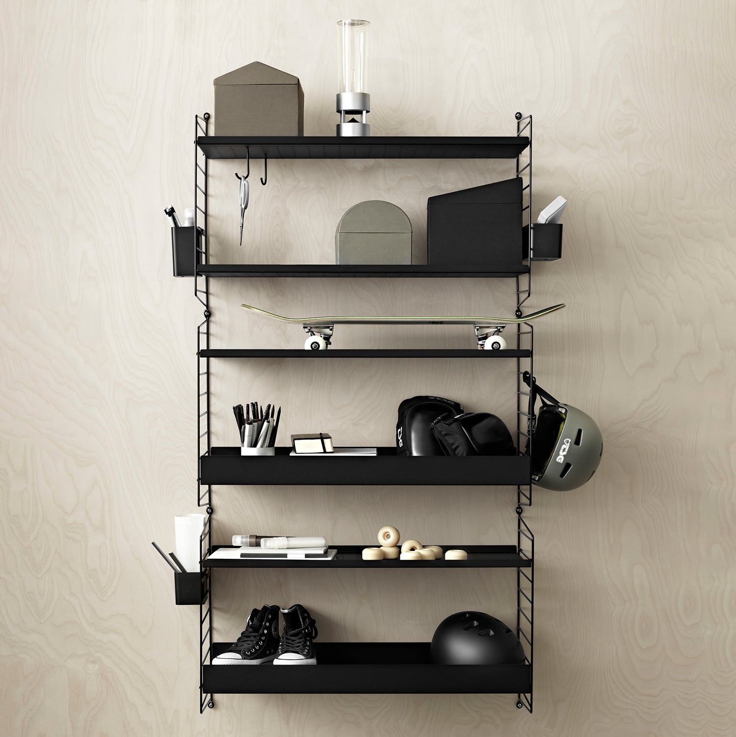 For ekstra funksjonalitet, kombiner metallhylle med kroker, stenger, henger holdere og flaskebrett. Designet av Nisse Strinning.