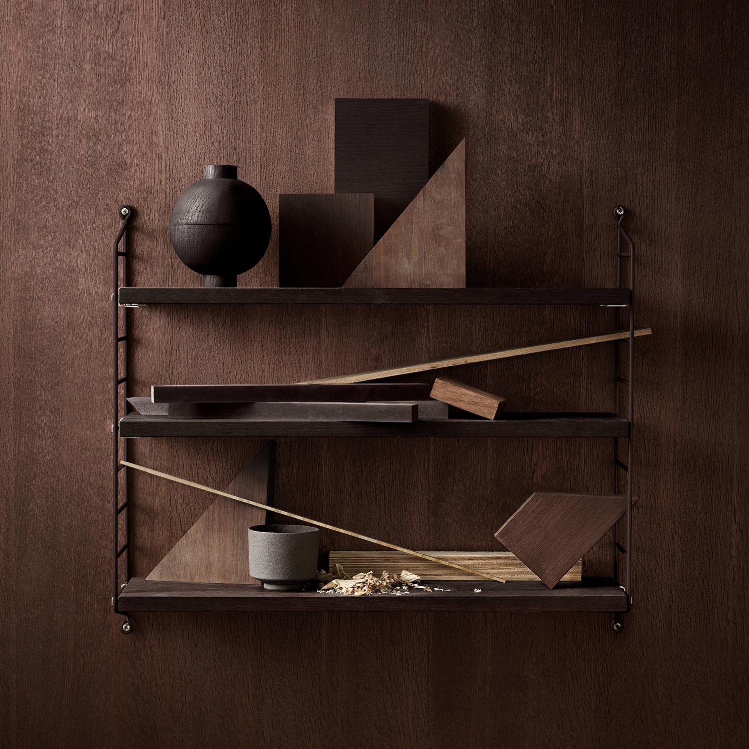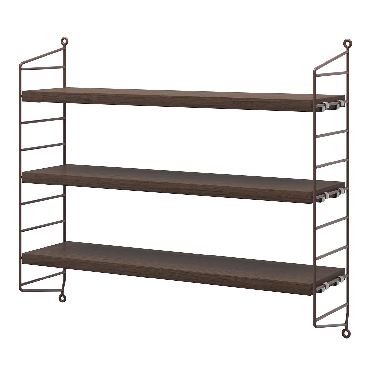 NYHET fra String, String Pocket hylle i mørke brun eik med mørke brune gavler.