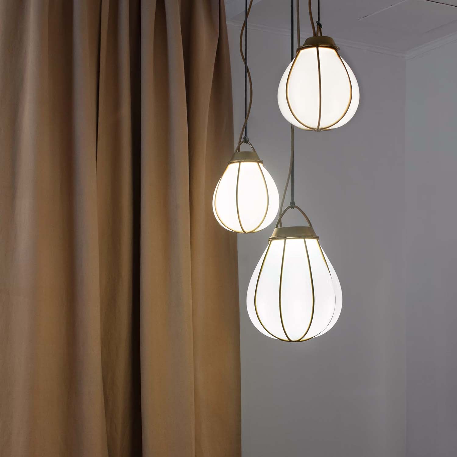 Hobo er laget av munnblåst glass formet i en kurvkonstruksjon av rå messing. Opphenget består av et farget tau, koppen i taket er også rå messing.